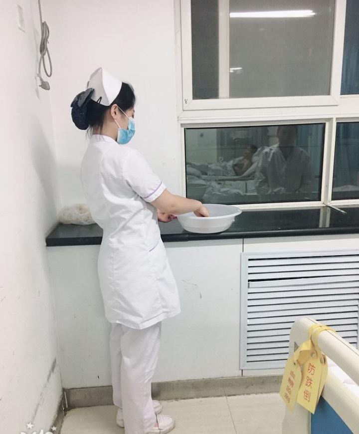 图片为老年病科护士为一位抑郁症患者打洗脚水!(注:患者烦躁时只有开心果的我们能够哄好这些患者)