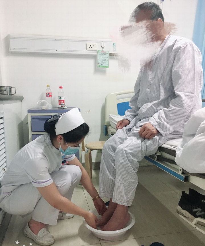 看,效果不错吧,经过我们护士的耐心开导,这位大爷终于同意用热水泡脚,护士说泡脚不仅促进血液循环,还能让大爷心情愉悦,大爷笑了,说:对对,你们呀都跟自己家得亲闺女一样!
