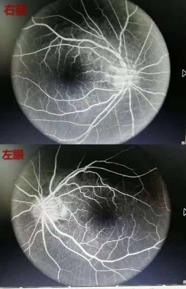 进一步追问病史,于女士有糖尿病病史5年,平时口服降糖药物治疗,现血糖控制平稳,但从未进行过眼底检查。朱大夫为于女士进行双眼荧光素钠眼底血管造影检查,结果显示:双眼糖尿病视网膜病变Ⅱ期。双眼荧光素钠眼底血管造影如图: