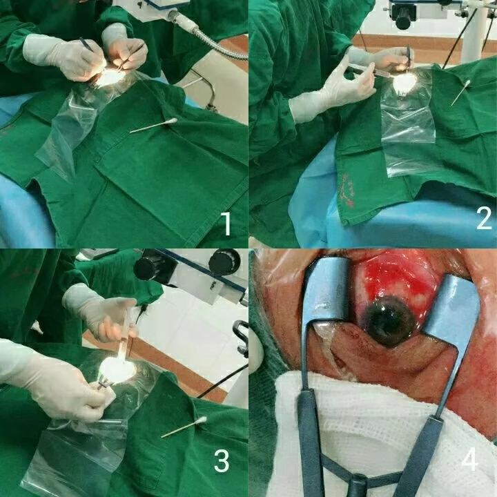图1、2、3:翼状胬肉手术术中,图4:翼状胬肉手术后