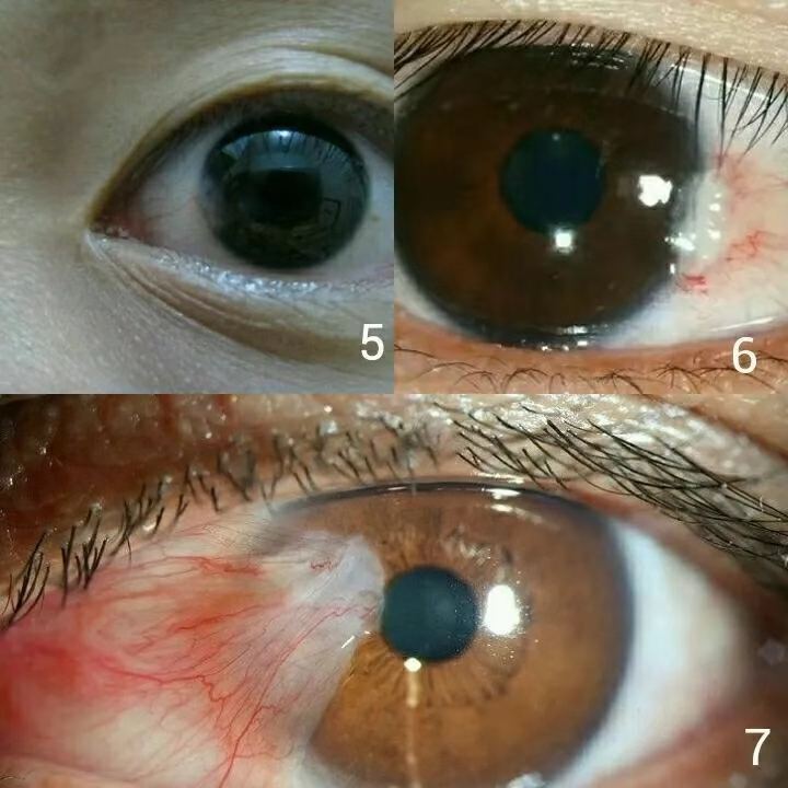 图5:胬肉在角膜缘,无明显充血,属于静止期,图6:胬肉在角膜缘,但是胬肉有血管充血,活动期,这个时期胬肉生长较快,图7:胬肉已发展至瞳孔边缘,且充血,此时胬肉进展会很快。