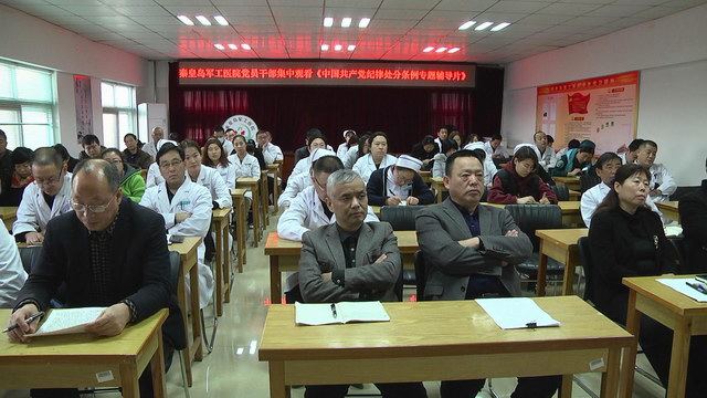 2018年12月4日下午,按照市卫计委党组统一部署,军工医院党委在大会议室组织全体党员集中观看《中国共产党纪律处分条例专题辅导片》。院领导班子成员及各党支部书记、全体党员和入党积极分子,以及各科室主任参加。