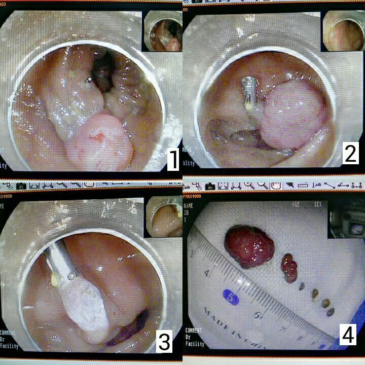 图1:结肠息肉,短粗蒂;图2:蒂部先行钛夹封闭;图3:圈套器息肉切除;图4:切除后的息肉标本,该患者不止1个息肉