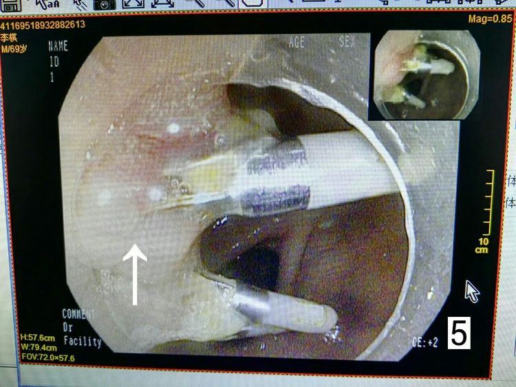 图5是1月后复查肠镜,在箭头所指位置,息肉的基底部再次取病理,病理回报炎性改变,无癌变。