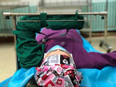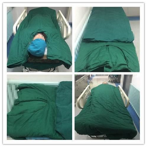 这是为了病人保暖设计的一款“U型”被,它是根据婴儿包被改良的,在以前被子的基础上加长加宽,将头部设计为“U型”,使用时可以将肩部包裹起来,只露头部,在转运的过程中起到了很好的保暖作用。