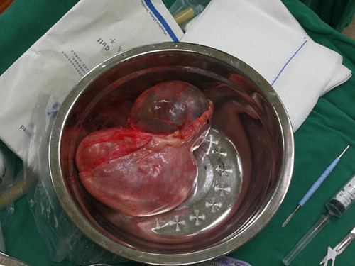 术前史志萍主任带领各位医生充分术前评估与讨论,做好恶性肿瘤手术准备。考虑患者比较年轻,还要保留患者生育功能及保持年轻的状态,并且卵巢两种性质肿瘤病发者少见等诸多问题,还要体谅和照顾到患者及家属对防止术后的衰老的强烈愿望,虽然患者在就诊北京各大医院时,各家医院均建议卵巢切除术,但是家属及患者对我军工医院妇产科全体医生非常信任,要求在我院住院手术。于2019年1月27日行开腹探查术,在手术室及病理科协作下,在北京专家的技术支持下,成功完整剥除双侧卵巢巨大肿瘤。快速病理回报确实为较罕见卵巢病发两种性质良性肿瘤,即双卵巢畸胎瘤及左卵巢粘液性囊腺瘤。手术保住了患者双侧卵巢,保留了患者生育功能。