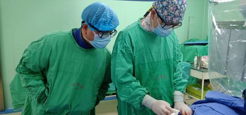 医生立即向刘大娘家属交代造影结果及进一步介入治疗方案,经过反复沟通,家属同意为她进行动脉瘤栓塞术及颅内血管支架置放术。2019年2月9日大年初五9点40分,神经外科介入医生团队在介入中心为刘大娘实施颅内动脉瘤栓塞术及经皮穿刺脑血管腔内支架置放术。因刘大娘动脉瘤为多形性,就像“羊犄角”,这为手术增添了难度。在北京专家及陈志永医生、王振兴医生的共同努力下,经过一个多小时的精准手术,11点30分手术成功完成。