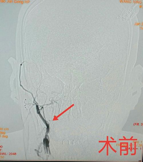 王先生,因头晕和左侧肢体无力,在军工医院神经内科住院治疗。医生给予全脑血管造影检查,结果显示右侧颈内动脉完全闭塞,右侧脑组织靠侧枝供血,侧枝代偿的血管存在重度狭窄。如果再发生闭塞,王先生发生梗塞的脑组织面积将进一步扩大,病情加重,甚至危及生命。
