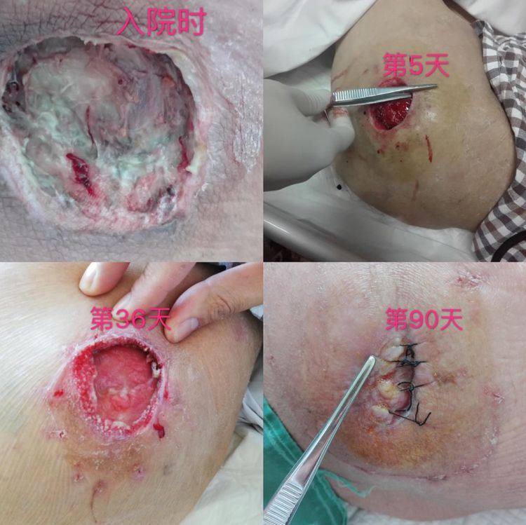 压疮,是让卧床患者及其家属谈之色变、难以挥去的沉重阴影。军工医院骨二科收治这样一位多处压伤的失能老年患者,左髋部可见约6x8cm皮肤破溃,深达深筋膜,创面基底为坏死的筋膜组织,少量脓性分泌物,创缘周围约12x9cm皮肤红肿,皮肤温度较高。左膝.前可见8x8cm皮肤红肿温度较高,压痛,波动感,无明显骨擦感。左外踝部可见约2x2cm皮肤破溃,深达皮下,创面肉芽组织新鲜,部分创面瘢痕愈合,踝关节皮肤红肿,皮肤温度较高;右足内缘可见散在皮肤坏死已瘢痕结痂;右肘外侧可见约1x2cm皮肤破溃,深达骨质,创面肉芽组织新鲜,部分创面瘢痕愈合,创缘周围约4x4cm皮肤红肿,皮肤温度较高。这位多处压伤的失能老年患者,你是否能够想象在90天里会彻底恢复平整的皮肤。这是军工医院骨二科医护团队又一次创造的奇迹.....