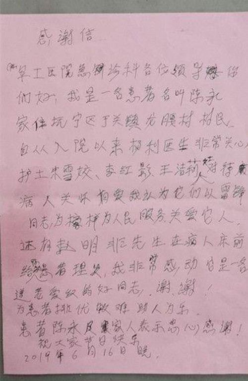 原来,陈大爷即将康复出院,为了表达谢意,特意手写了一封感谢信,送给科室的医护人员。刚入院时,陈大爷情绪低落,不配合医生护士的治疗,整天唉声叹气,郁郁寡欢。医护人员积极主动与他聊天,在长期的心理护理及安慰下,陈大爷说出了自己的家庭状况。陈大爷家庭比较困难,在偏远的山区,家属探望比较困难,了解到情况后,科室主任、护士长及主管医生、责任护士每天主动、耐心的与他交流沟通,介绍相关疾病知识,为他修剪指甲、剪头发,不断鼓励他树立战胜疾病的信心,早日康复恢复正常生活。