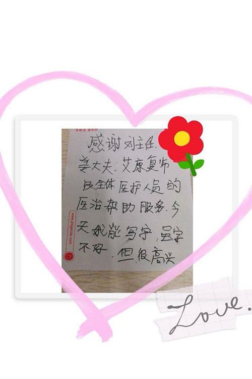短暂的治疗,明显的效果,让刘阿姨和家人非常高兴,刘阿姨的心态逐渐地好了起来,从刚入院时的愁眉苦脸,变的喜笑颜开,并有了继续生活下去的勇气和希望,从此更加配合医生及康复师的治疗,又经过一个月的专科治疗,刘阿姨病情进一步好转,书写文字变得愈加工整,右手可以完成系扣子、织毛衣、梳头发、用筷子等复杂的精细动作,并可以独立行走。