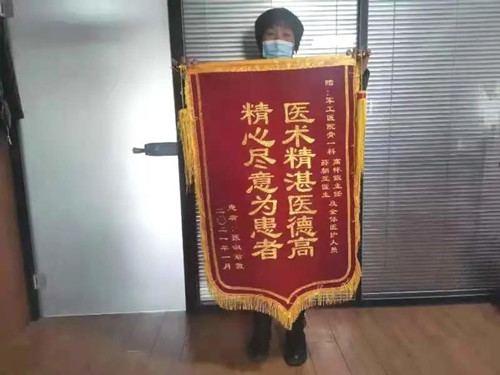2021年3月2日,出院已有两个多月的张阿姨及其家属,将写着“医术精湛医德高,精心尽意为患者”的锦旗送到军工医院骨一科,表达对高怀银主任团队精湛技术的肯定及医护人员无微不至照顾的感谢。