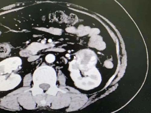 泌尿外科副主任刘荣新详细为患者查体,并根据社区医生的病情描述及查体结果,当天便为患者开具了具有针对性的肾脏增强CT检查。结果明确患者肾脏区域有肿瘤生长,约4㎝大,提示:左肾透明细胞癌可能。