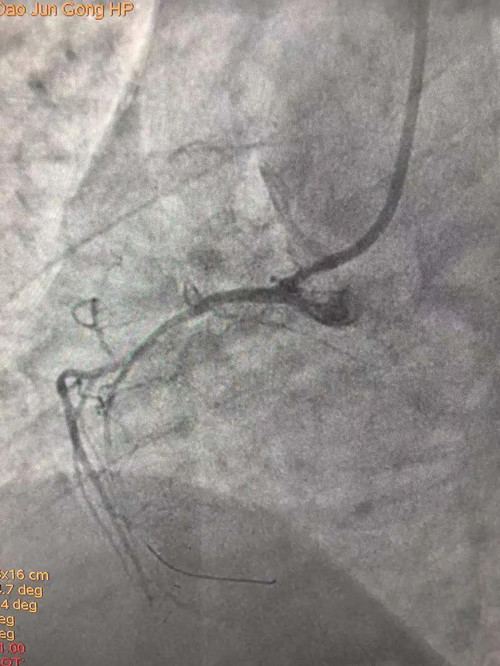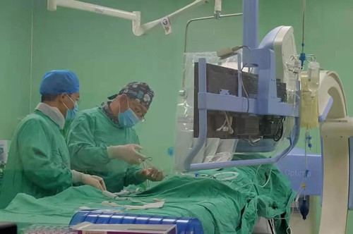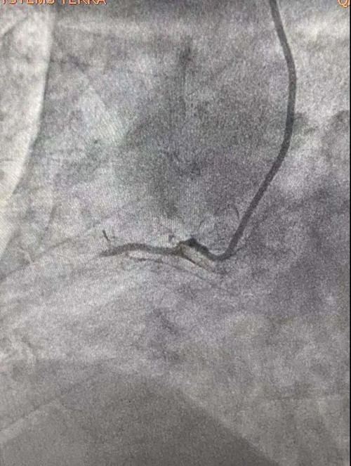 患者胸痛明显,伴有大汗,造影显示右冠近段严重百分之百闭塞,手术过程异常艰辛。重症医学科王秋艳介入团队医生应用1.5*15球囊反复小压力扩张,现在摆在医生面前的难题是既要打开血流又不能将血管扩撕,1.5球囊扩张后应用替罗非班,再次应用2.0球囊低压力持续扩张,此时显影出现右室支,患者症状立即缓解,血流恢复。由于患者右冠细小,不适合做支架,所以决定回病房继续药物治疗。