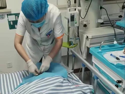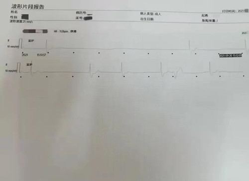 康医生为患者办理了入院,详细询问病情并进行查体。听诊心率慢,查心电图结果显示:心率不足40次/分。入院后患者心电监护显示十余秒的长间歇并出现黑朦症状。心内一科主任王春梅了解情况后第一时间对患者病情进行评估,需立即安置心脏起搏器,但此次病人病情危重,去手术室过程中随时会出现心脏停搏、猝死的可能,不适合转运,王主任迅速与患者家属沟通后果断决定紧急行床旁临时起搏器植入术。由颈内静脉穿刺,送入漂浮电极并连接临时起搏器,起搏成功,为挽救患者生命争分夺秒。