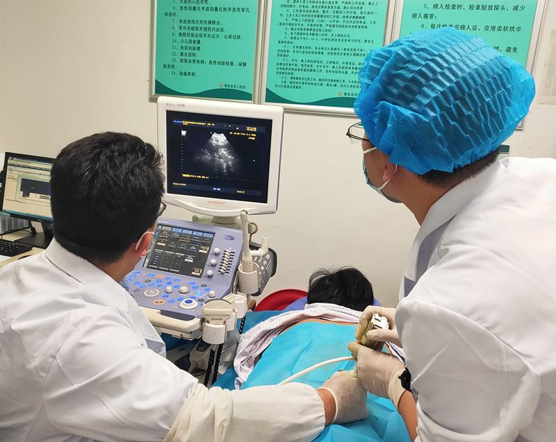 肾穿刺活检术是在超声引导“可视”下进行,局部麻醉后进行穿刺,穿刺过程用时仅数秒,无明显痛感,安全可靠,术后无痛苦,不会留有腰疼等远期并发症。肾穿刺活检仅穿出少许肾脏组织,不会影响肾功能。这也是临床医生准确诊断肾脏疾病的“金标准”,对肾病的诊断治疗有重要的临床意义。李建军主任和彩超室王守业主任经研究,在原有肾穿刺活检术方法的基础上进行了改进。在高清的彩超引导下,穿刺过程更清晰,探头安装穿刺固定支架,进针方向由垂直进针改为斜向下穿刺,穿刺针型号进行个体化选择,定位准确度高,取材精准,出血风险小,成功率高。