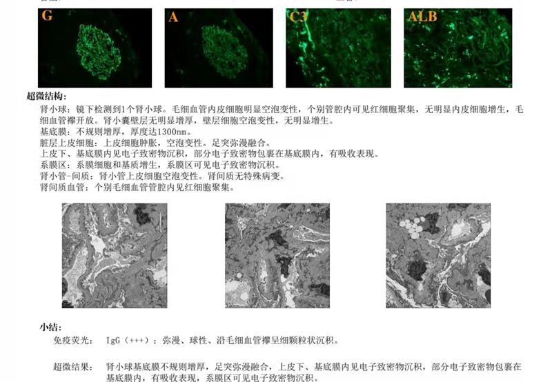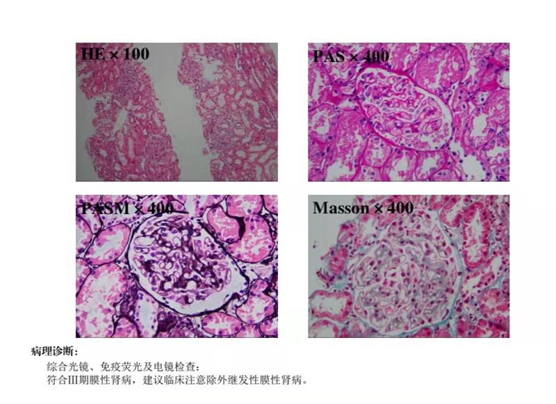 李建军主任为患者进行详细检查,结果显示三高一低,暨高蛋白尿、高度水肿、高脂血症以及低蛋白血症,初步诊断为肾病综合征,并办理了入院手续。入院后为患者进行PLA2化验,结果显示阴性。为明确诊断,制定个体化诊疗方案,指导临床治疗,判断预后,李主任建议患者行肾穿刺活检术,并给予相关知识讲解,患者及家属表示同意,并顺利进行了肾穿刺活检术。