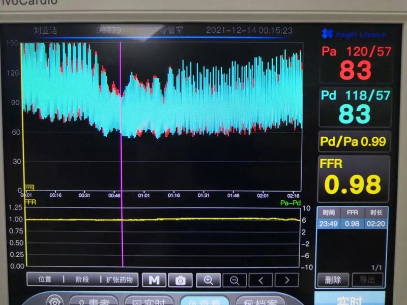 于主任使用医院新引进的压力微导管为患者完成FFR检查。检查结果为0.98,高于临界值0.8,明确患者无需行心脏支架治疗。
