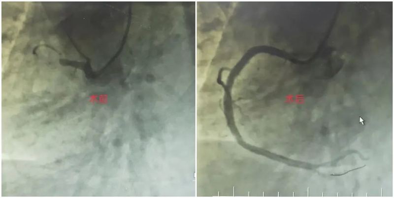 全力以赴救生命,责任担当医者心。两位主任继续为患者行冠脉造影检查,介入中心医护协助配合。造影显示患者心脏右冠状动脉近端闭塞,两位主任立即为患者开通闭塞血管,置入支架一枚,术后ST段回落,患者胸痛症状缓解,生命体征平稳,顺利转入心血管内一科CCU病房监测治疗。