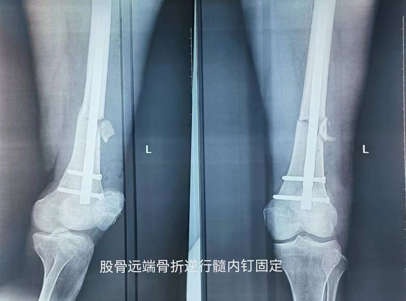 骨二科韩双阳主治医师为患者详细检查。患者左大腿远端畸形、肿胀、淤青伴疼痛,不能站立及行走。CT检查显示为左股骨远端骨折。韩医生报请孙笛主任共同制定手术方案,因骨折的部位位于股骨远端决定实施左股骨干骨折闭合复位倒打髓内钉内固定术。这种术式为患者的骨折可起到非常稳定的固定作用,经过一列术前准备,孙笛主任与韩医生共同为患者进行了手术。