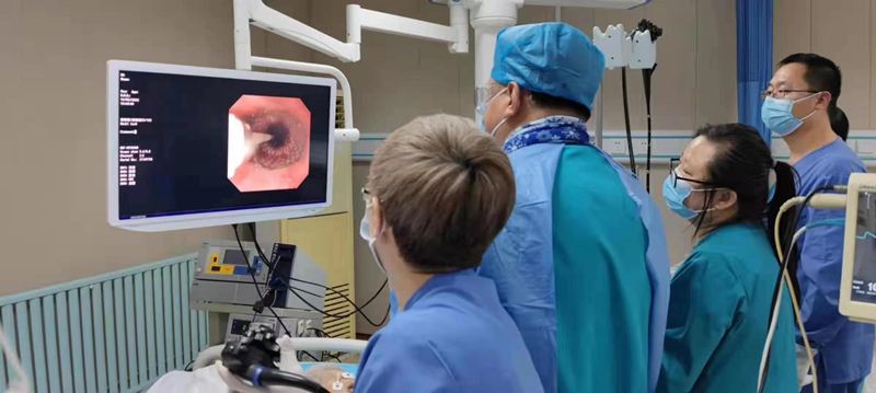 孟主任首先为患者进行胃肠减压,引出大量潴留液。随后,又马上为患者安排经内镜肠梗阻导管置入术。肠梗阻导管经鼻送入胃腔,胃镜下可见大量食物残留,未见胃石,胃腔内可见肠梗阻导管,予以活检钳夹肠梗阻导管头端固定线,经胃镜通过幽门进入十二指肠降段,可见肠腔扩张,大量食物残留,继续送入肠梗阻导管到达屈氏韧带以下,退出导丝,向前水囊注水15ml,术毕。术后患者大量排气、排便,腹痛明显减轻,肠梗阻很快缓解,效果立竿见影。