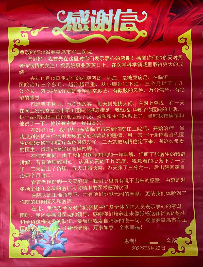 近日,秦皇岛军工医院收到来自山东省临沂市“糖尿病足”患者及家人邮寄的感谢信、锦旗。患者的感谢与认可伴随着这一份快件传递到秦皇岛军工医院内分泌科医生手中。