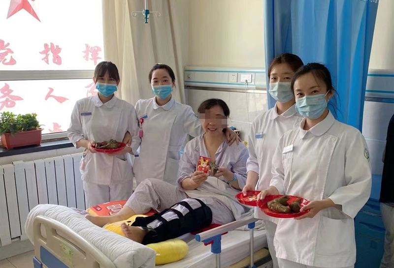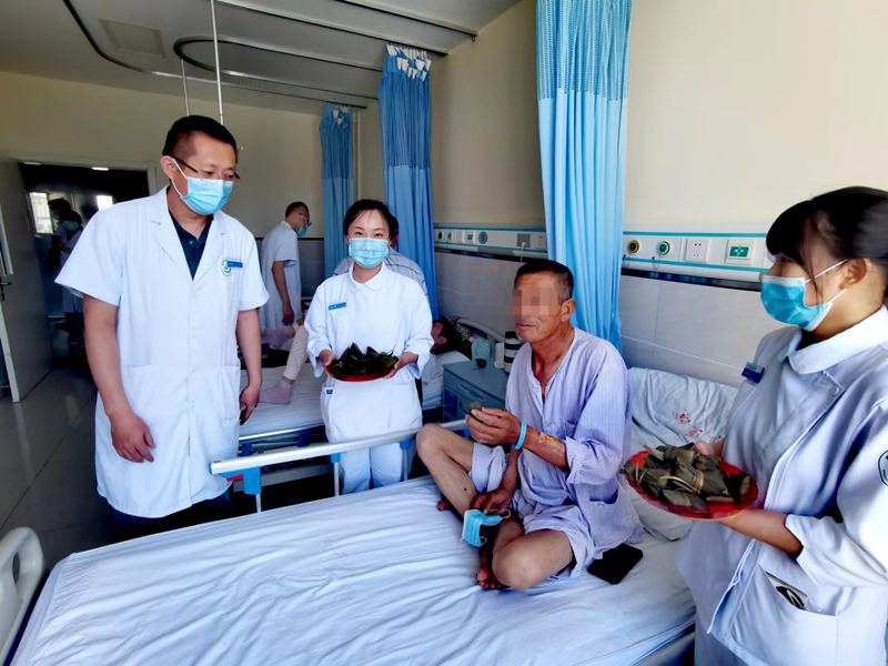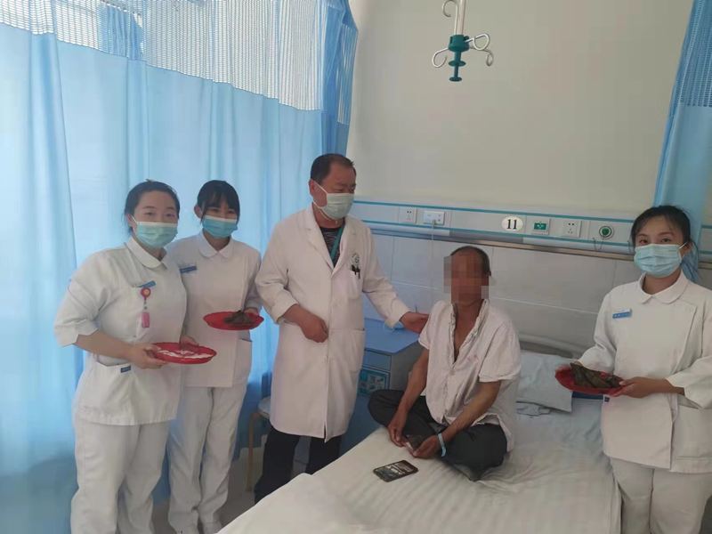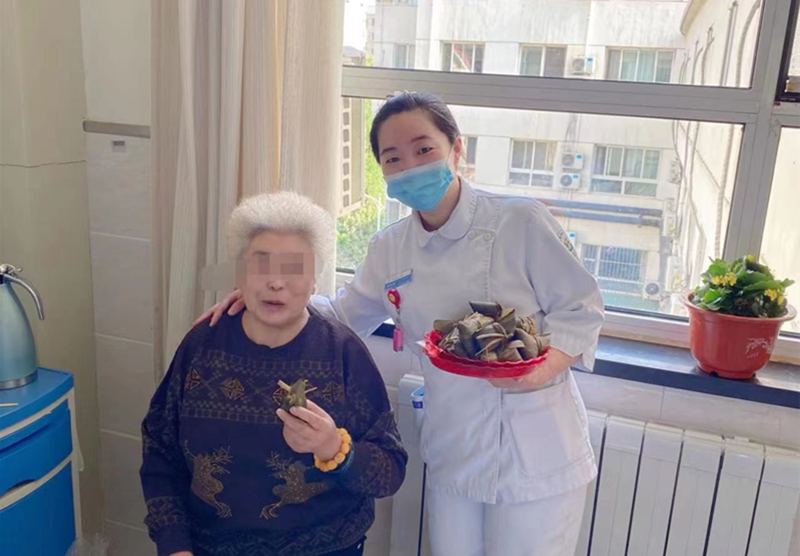 患者张阿姨脑出血术后,还在康复期,她和老伴不能回二百里地外的青龙老家过节了,叔叔接过粽子,掉下了激动的眼泪,拉着护士长的手说:“闺女,太感谢你们了,过节还想着我们,以前你姨身体好的时候,她把我们一大家子的粽子都包出来,今年她这种情况,我都忘记过节了,更没想过还能吃上家里的粽子,一定替我谢谢你母亲,等你姨好了,明年我们包粽子给你们送来,你们有空了全科都上我们老家玩去啊。”