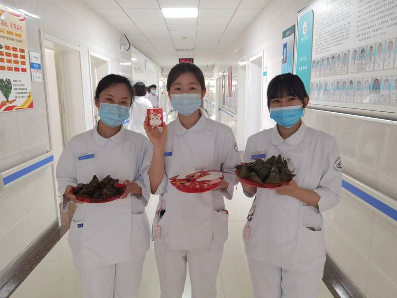 6月2日早交班后,骨一科薛朝亚主任、神经外科张凤君主任、孙冰岩护士长带领全科医护人员将心意满满的粽子送到每一位患者手中,并送上节日的问候和祝福,一缕缕粽香传递的不仅是唇齿间的美味,更是聚成一股暖流流入患者心间。