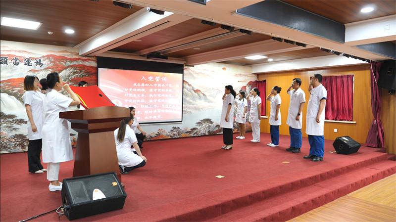 全体党员重温入党誓词。纪委书记李爱琴领誓。