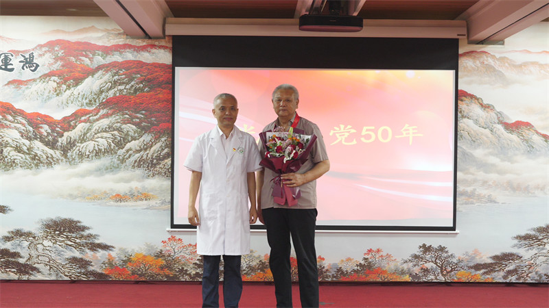 党委书记李怡华为“光荣在党50年”老党员颁发纪念章。