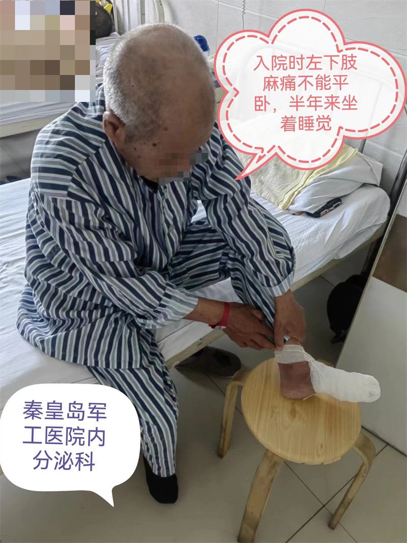 近日,80岁男性糖尿病患者因双下肢疼痛伴左足溃烂半年到秦皇岛军工医院内分泌科就诊。内分泌科副主任张杨详细询问患者情况并查体,患者平卧位下肢麻木疼痛加重,左侧为重,半年的时间均为端坐位间断入睡,痛苦万分,辗转多地就医,曾进行腰椎手术及局部换药治疗,症状无好转,患者饱受病痛折磨,为求诊治,来到秦皇岛军工医院糖尿病足门诊就诊。医生为患者查体,建议入院治疗。
