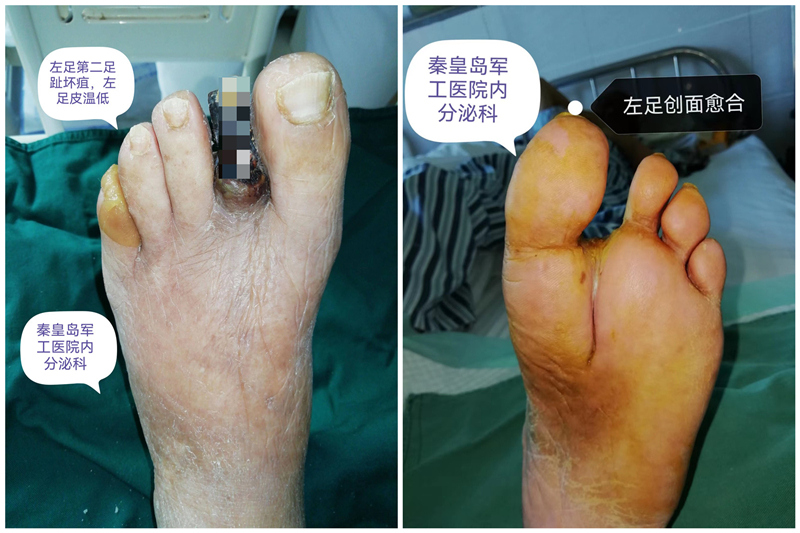 经过近2个月的治疗,患者下肢麻木、疼痛消失,左足创面愈合,保足成功,康复出院。患者以后可正常行走、正常生活,患者及家属非常开心!糖尿病足专病门诊简介