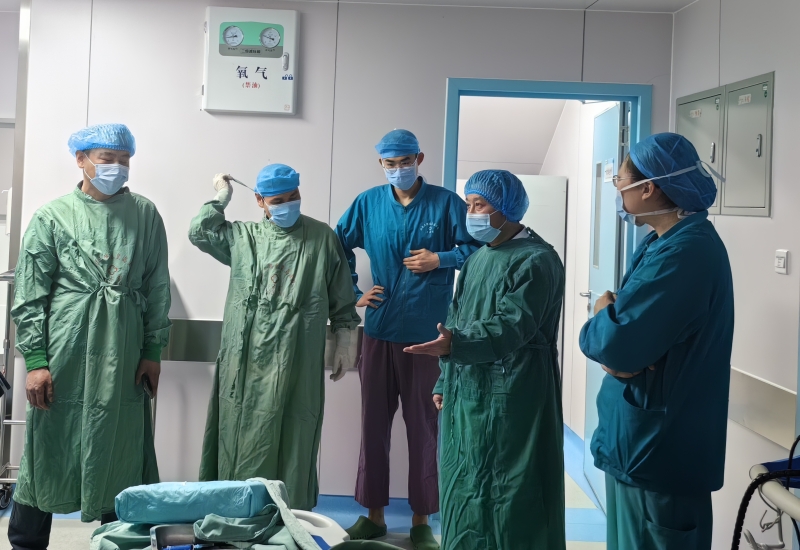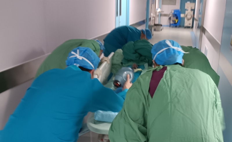 演练场景为手术室内正在进行手术,护士发现1号手术间区域有浓烟和火情出现,火势迅速蔓延,她立即按动最近消防按钮,警铃随即响起。与此同时,手术室内非主刀医护人员分成两组,一组断开燃火部位的电闸并拿取相应消防器械第一时间进行紧急灭火,医院消防队接到警铃通知随即前往协助扑救。二组立即报告麻醉科手术室护士长王芳与本楼其他科室负责人着火情况,由护士长根据火情距离统筹协调其余术间的安全处置。此时3号手术间正有1台全麻胆囊切除手术进行中,接到撤离指令后,护士打开安全通道,关闭氧气电源,尽可能转移贵重仪器及资料。无影灯下,主刀医生迅速吩咐:“关闭伤口!”在助手的帮助下,快速将患者腹部切口进行缝合,并覆盖消毒纱布垫,护士及时用消毒绷带绑紧腹部,大家合力将全麻患者小心移至转运车上。麻醉医生拔下患者的固定呼吸机,换上简易呼吸囊,手控维持患者呼吸,患者成功完成转运。在短短几分钟时间里,术中患者就从手术室被“抢救”到了安全区域。手术区内的其他工作人员也陆续转移到安全地带。