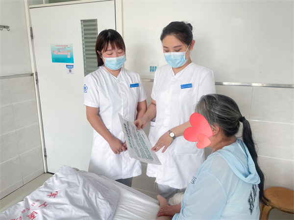 护士们与患者及家属沟通交流、讲解疾病知识、进行饮食健康宣教、讲解日常生活中的注意事项,并及时了解患者的心理情况及生活困难,做出护理个性化调整,为患者排忧解难。