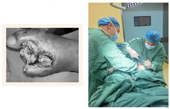张杨主任考虑患者病情急重,立即组织团队进行抢救,医护通力合作,紧急进行糖尿病足清创及截趾术,术后经过精心治疗及护理,患者2天后脱离生命危险,后期张杨主任团队予以蚕食清创术、VSD及点状植皮术,经过45天的治疗,患者创面彻底愈合,并且可以正常下地活动。