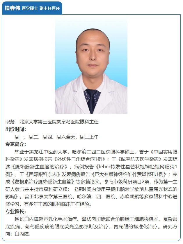 北医三院秦皇岛医院眼科配备先进的眼力健超声乳化机、蔡司手术显微镜、眼底照相造影一体机、微创玻璃体切割系统等设备,在糖尿病视网膜病变、复杂青光眼、白内障、眼外伤等疾病的诊疗方面经验丰富。科室医生始终坚守“患者至上”的服务宗旨,致力于通过精准诊疗与健康管理,守护每一位患者的“清晰视界”。
